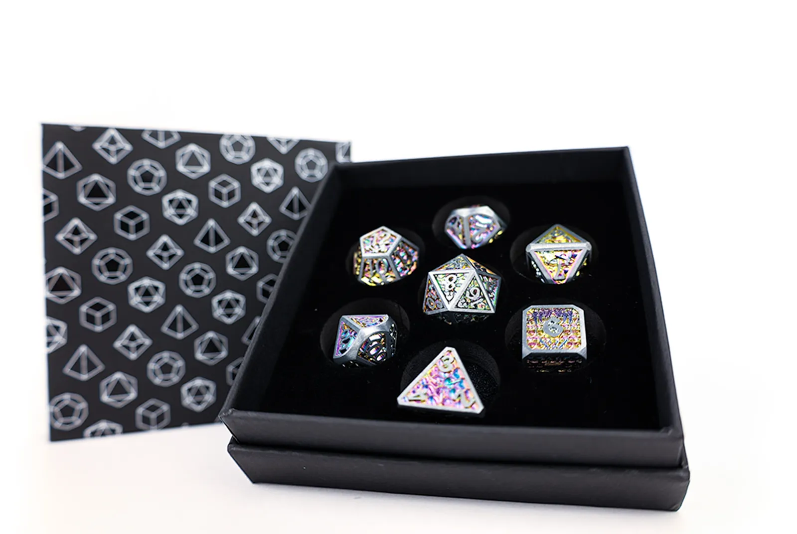 The dice comes in a giftable box with a unique design, with foam divets to keep the dice secure and safe.