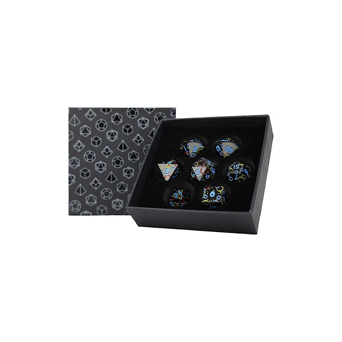 The dice come in a giftable box with a unique design, with foam divots to keep the dice secure and safe.