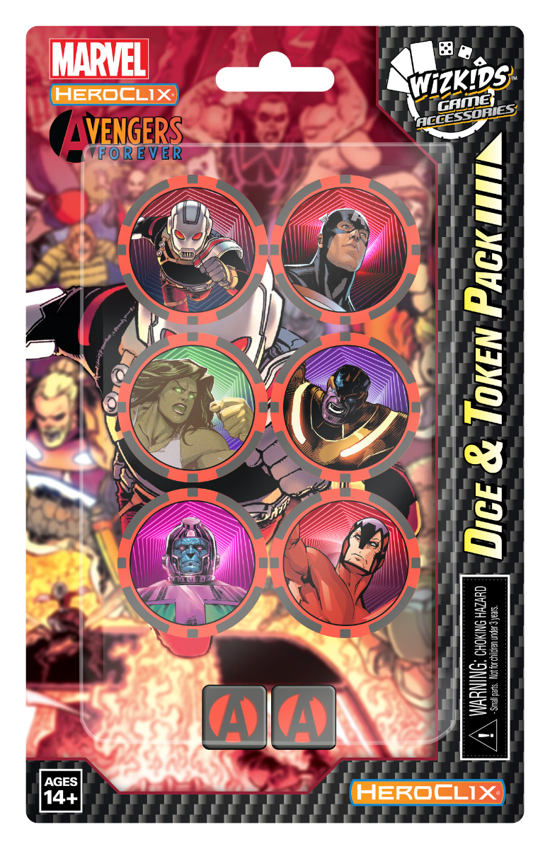 Help the Invincible Ant-Man assemble a new team of Avengers to answer threats to the multiverse! Dice and Token Packs contain 2 custom dice featuring a special logo to match the set, and 6 action tokens featuring fan-favorite characters from the set including Thanos, Kang the Conqueror, Klaw, She-Hulk and Captain America! On the reverse side of these action tokens, players can find Bystander tokens to use with figures in the set to help complete their Avengers Forever collection.