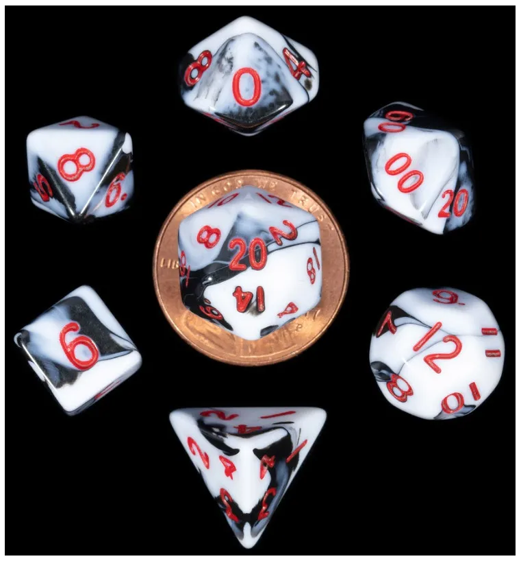 Perfect for gaming anywhere, anytime! At 10mm, these mini dice sets easily fit in your pocket so you can bring your dice everywhere you go. Each polyhedral set comes with 7 dice (d4, d6, d8, d10, d10 (00-90), d12, and d20).