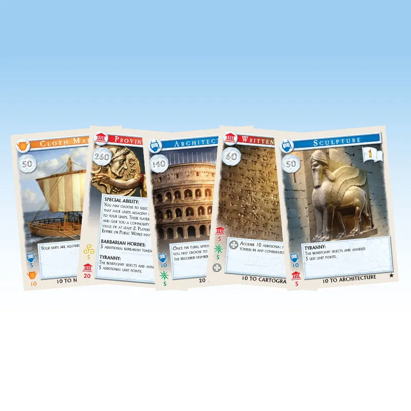 Mega Empires: The East is a stand-alone game the Mega Empires line, a new intricate board game designed for 3 to 9 players, immersing participants in the rise and development of ancient civilizations over a span of 8000 years, set in a different part of the world. Players will guide their civilizations from the Middle East to India, focusing on territorial expansion, cultural and technological advancement, trade, diplomacy, and overcoming various calamities. The main goal is to gain the most victory points by trading commodities and developing advancements strategically, showcasing each civilization's prosperity and influence.