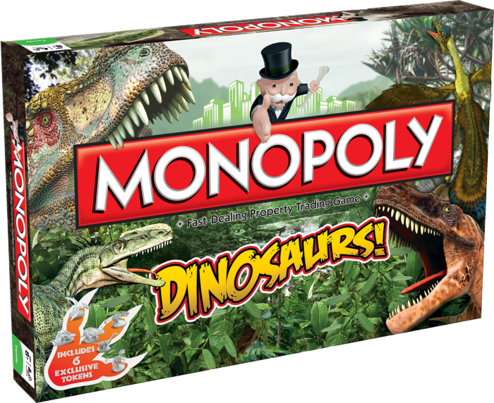 Step back in time with this special Dinosaur Edition of the MONOPOLY game. Learn fun facts about popular dinosaurs as you buy, sell and trade the Spinosaurus, Velociraptor, Stegosaurus and more. Game includes beautiful illustrations of dinosaur species and six collectible fossil tokens depicting a dinosaur egg, footprint, skeleton, T-Rex skull, Triceratops skull and claw. A prehistoric relic for dinosaur enthusiasts of all ages.