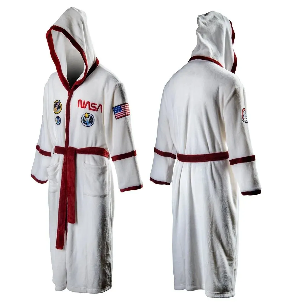 Transform your lounging experience with the NASA Astronaut Bathrobe. Made with high-quality super soft fleece, this bathrobe features the 1975 NASA logo embroidered on the chest, assorted mission patches, and two deep pockets. Finished with a red tie belt. Ideal for space enthusiasts, it offers ultimate comfort for your relaxation time.