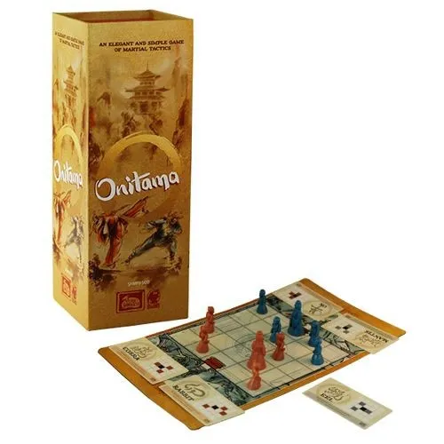 Onitama is a two-player, perfect information abstract game with a random starting set-up. On a 5x5 board, both players start with five pawns on their side, with the main pawn in the middle.