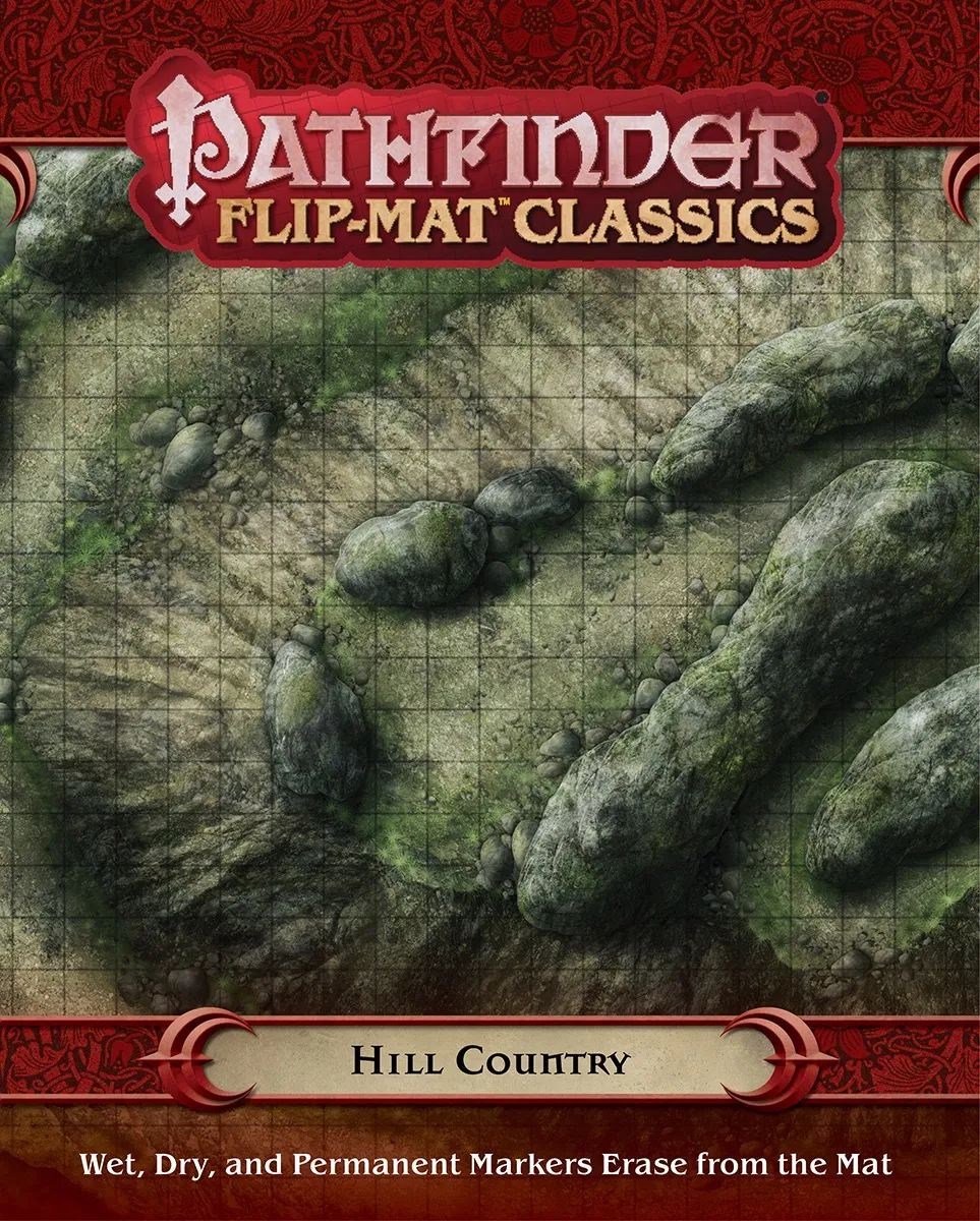 Whether your party is tracking monsters through the misty highlands or fighting a guerrilla campaign against an invader, no Game Master wants to spend time drawing every fold and bluff that the party might hide behind. Fortunately, with the latest Pathfinder Flip-Mat Classics, you don't have to! This line of gaming maps provides ready-to-use and detailed fantasy set pieces for the busy Game Master. Whether you need to hide an ambush or battle deadly beasts, this double-sided combat mat makes the perfect setting! Don't waste your time sketching when you could be playing. With Pathfinder Flip-Mat Classics: Hill Country, you'll be ready next time your players venture out into the wilderness! This portable, affordable map measures 24" x 30" unfolded, and 8" x 10" folded. Its coated surface can handle any dry erase, wet erase, or even permanent marker. Usable by experienced GMs and novices alike, Pathfinder Flip-Mats fit perfectly into any Game Master's arsenal!