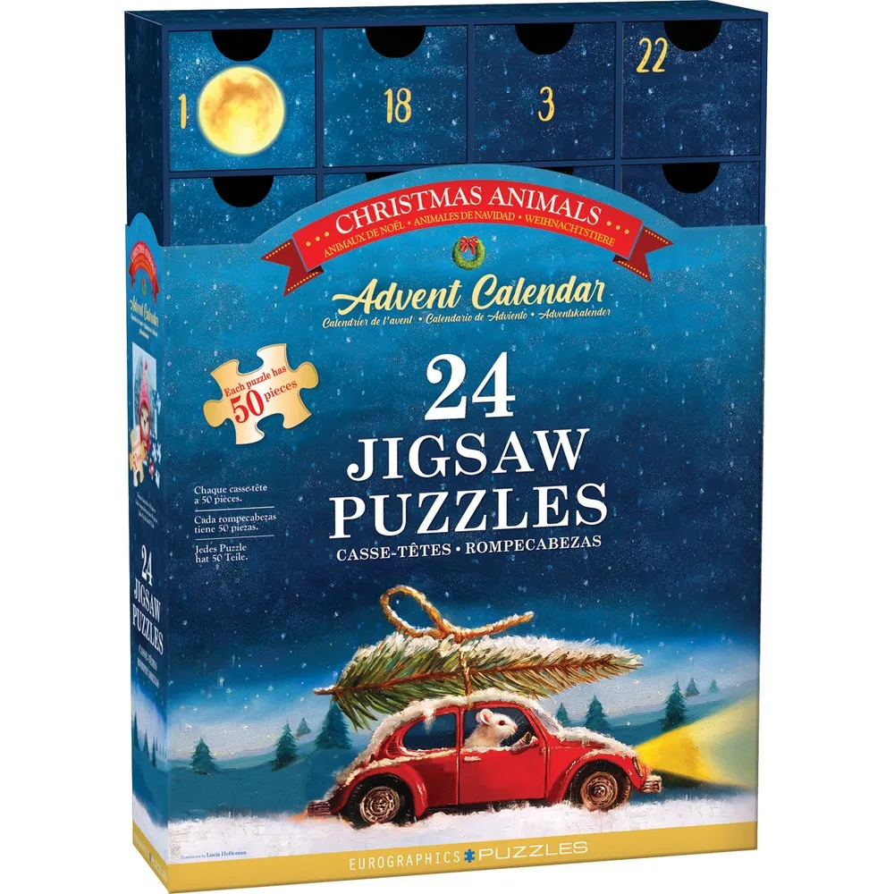 Experience the magic of the holiday season with the Christmas Animals Advent Calendar by Eurographics, featuring the whimsical artistry of Lucia Heffernan! Behind each drawer, discover a charming 50-piece puzzle showcasing adorable animals in festive settings—from a mischievous mouse driving a tiny car to a fluffy cat dressed as Santa. Each puzzle is a delightful moment of joy, bringing the wonder of Christmas to life.