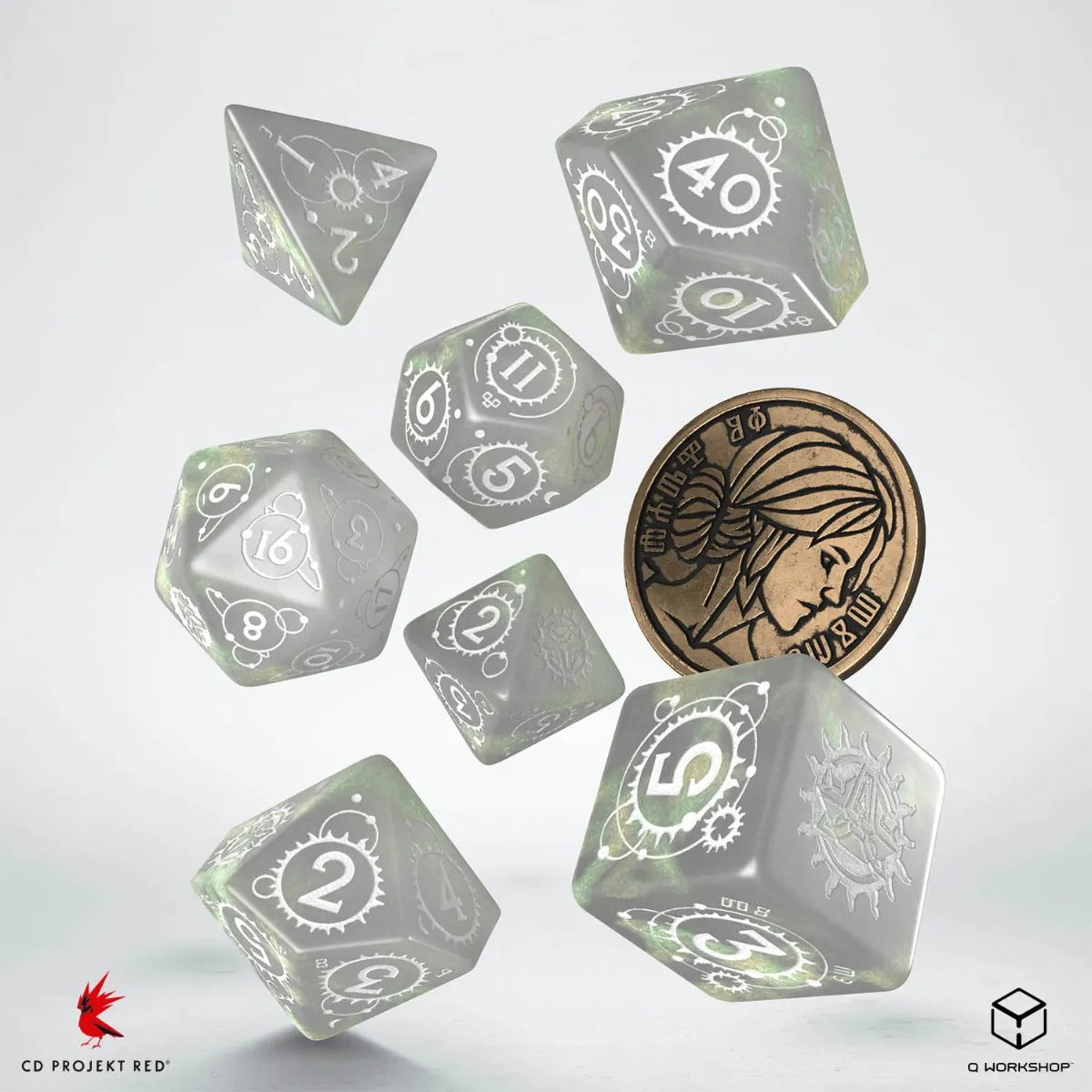 You can’t run from destiny. Inspired by The Witcher franchise, this dice set is dedicated to Cirilla Fiona Elen Riannon, a Surprise Child fate-intertwined with a certain Witcher. The set contains 7 polyhedral dice, and a metal coin featuring Ciri's depiction. Each die has white material with aquamarine engravings. The highest value faces, and coin reverse, are adorned with the School of Cat symbol.