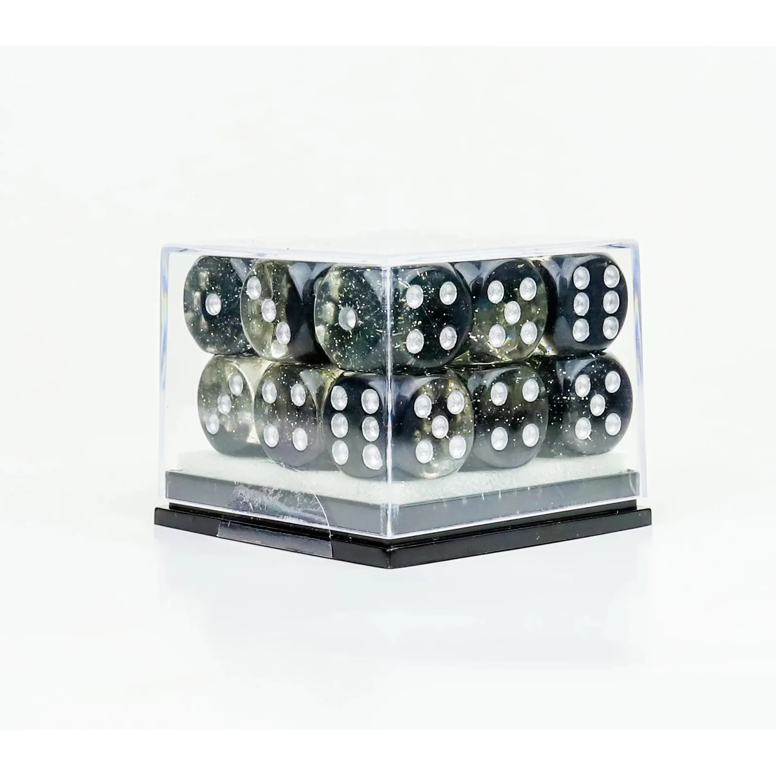 Stylized spades float in layers of glittering clear and black resin.  Eighteen (18) D6 dice in a square cube.  Dice are black and sparkling clear resin.