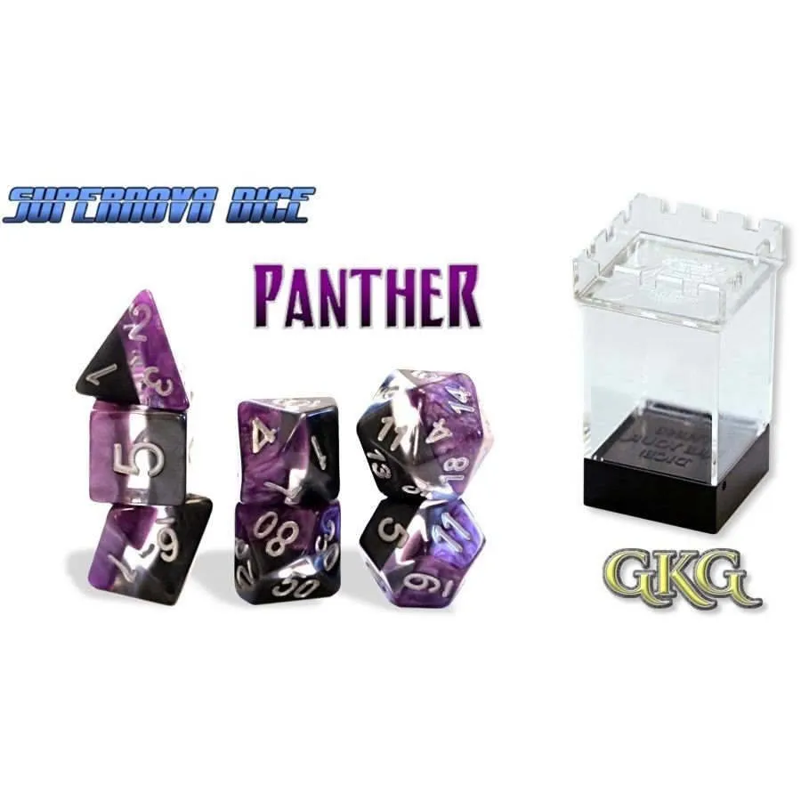 Supernova Dice are layered dice (3), from Gate Keeper Games, featuring two pearlescent colors with a band of perfectly transparent high-impact resin in the center! When viewed from the top they appear to be 1 color, when viewed from the bottom they appear to be an entirely different color, but when viewed from the side they appear to be 3 stunning layers enabling you to see right through the center of the die! Nothing beats the creativity of a Supernova Die! Each die has the high and low numbers centered on each of the two colors for high-speed number recognition. Every set comes in the GKG Dice Tower Dice Case! Made of high-impact resin, with the same original layering process we invented for Halfsies Dice in 2013 that prevents air-bubbles from forming inside, Gate Keeper Games dice bear the honor of being the heaviest, densest, and most well-balanced resin dice on the planet!