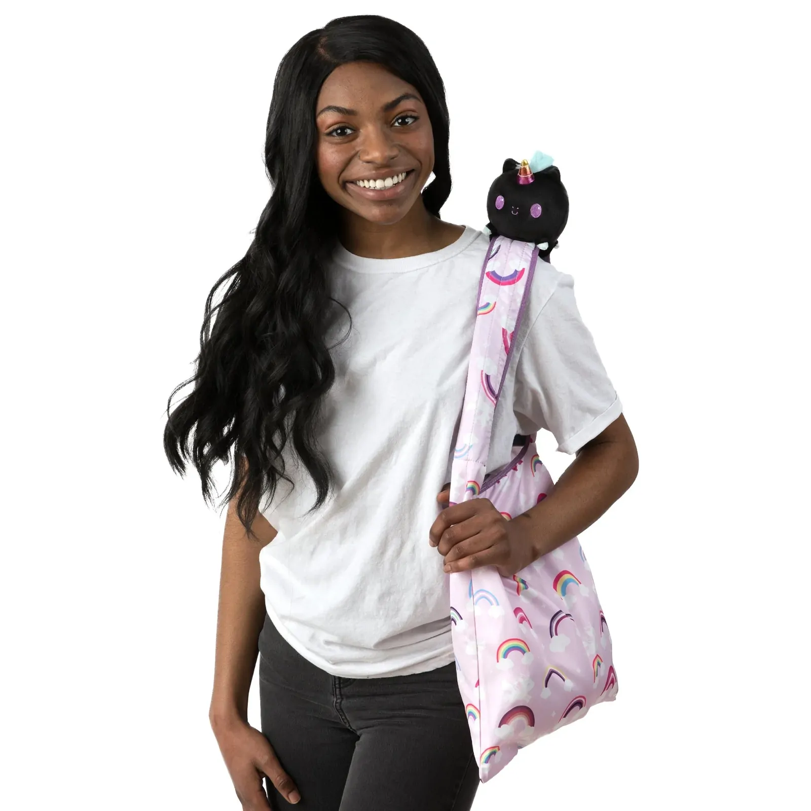 Express your style and take your plushie friend wherever you go while carrying everything you need for school, sleepovers, shopping, or just hanging out with friends! The bag has room for all your necessities, from your phone and charger to your snacks and water bottle.