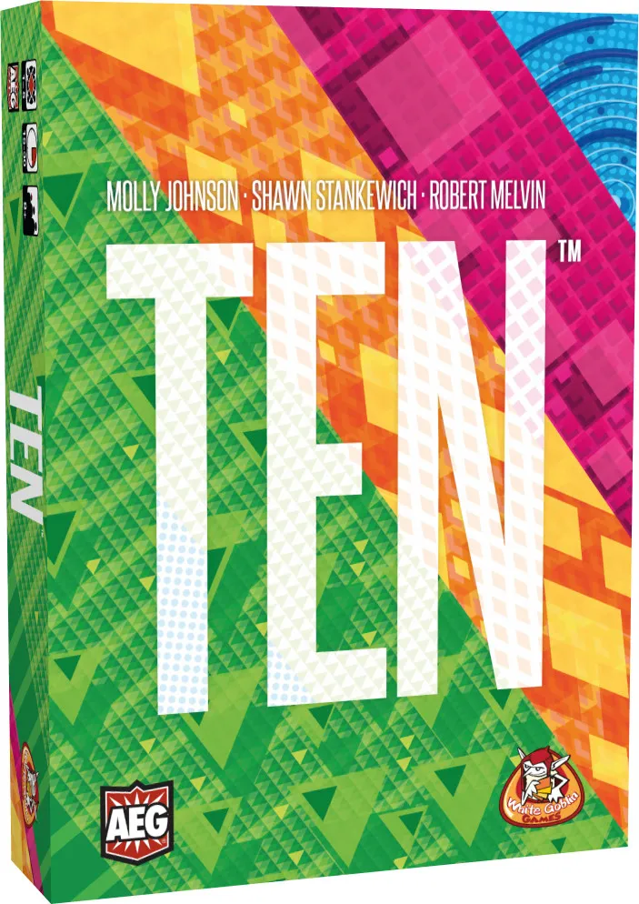 TEN is an exciting push-your-luck and auction game for the whole family! Players draw cards one-at-a-time, trying to add as many as they can without exceeding a total value of TEN, or they bust!