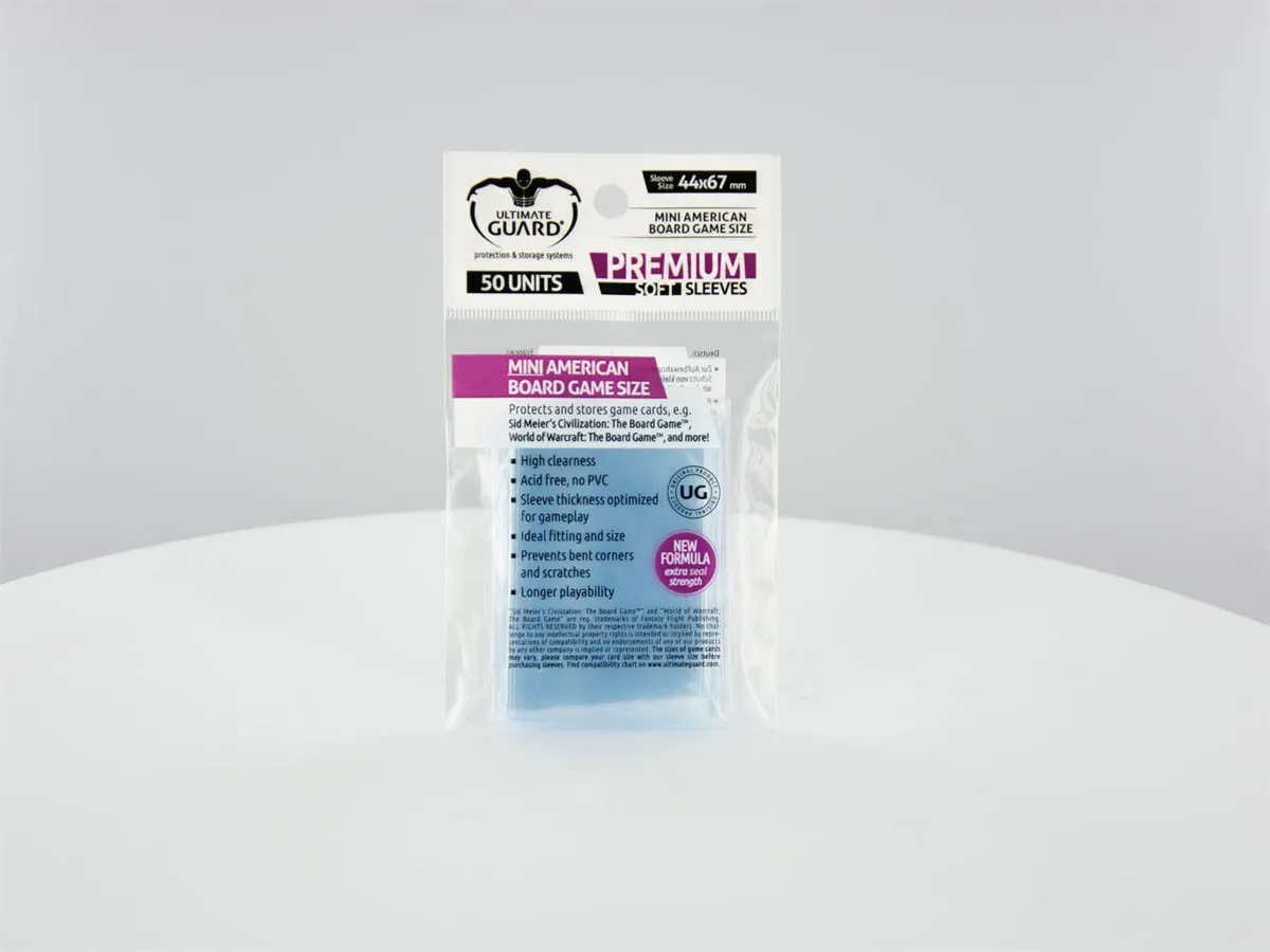 Protects and stores game cards, e.g. Sid Meier's Civilization: The Board Game™, World of Warcraft: The Board Game™, and more! 50 sleeves per pack. High clearness The high clearness of the material ensures a genuine image quality with unaltered contrast and colors. Ideal fitting and sizeOptimal fitted sleeves for a safe handling and a great playability of your cards. Acid free, no PVC This product is completely free of PVC and acidic materials and therefore ideal for collectible cards. Longer Playability and lifetime The extra durable material prolongs the lifetime of your cards and keeps them playable, even during heavy use Optimized thicknessSleeve thickness optimized for gameplay Prevents bent corners and scratches Keeps your most valued cards in mint condition to preserve their value and usability