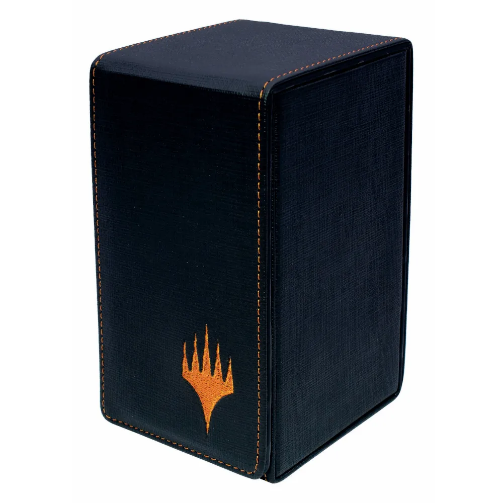 This Alcove Tower Deck Box features a black leatherette material with a mythic orange embroidered Planeswalker symbol and matching stitching. Store and protect up to 100 standard size trading cards double-sleeved in Ultra PRO Deck Protector® sleeves. This deck box is made with durable, high-quality materials; features a strong magnetic closure and locking mechanism to securely store your deck; dual thumb notches for easy access when you are ready to play; and a bottom drawer compartment for dice, coins, or other small gaming accessories.