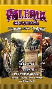This expansion pack adds an entirely new deck and gameplay mechanism to Valeria: Card Kingdoms. Available to every player, you have the option to hire an agent for one turn to take advantage of their unique skill.