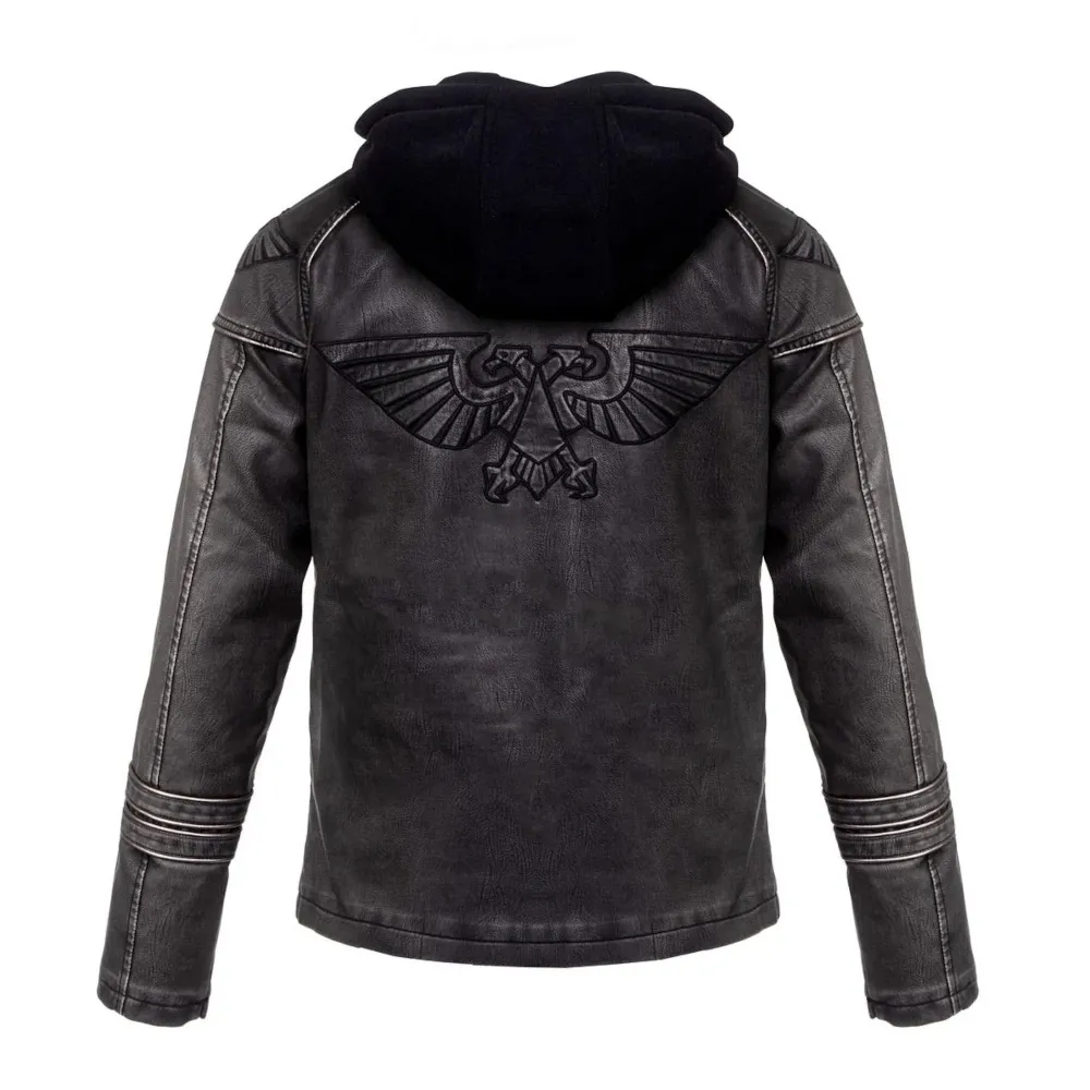 The back is decorated with highly detailed embroidery of the instantly recognisable Imperial Aquila, and each shoulder is expertly decorated with the icon of the Adeptus Astartes, the superhuman Space Marines. The panelled design features a weathered effect along the seams, giving the illusion of real leather.