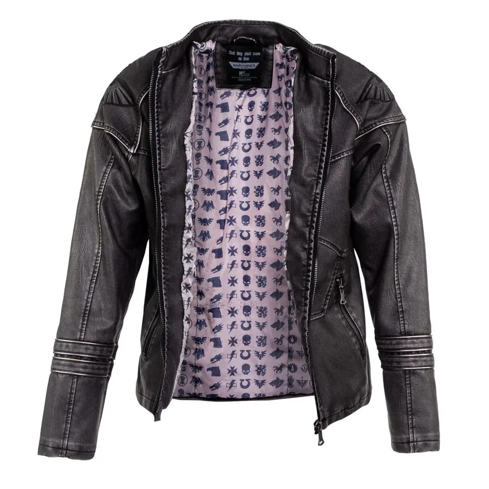 For ultimate comfort, this jacket is fully lined with a uniquely patterned fabric depicting the icons of some notable legions and chapters of the Space Marines, including the Ultramarines, Blood Angels, Iron Hands, Imperial Fists, Space Wolves, Salamanders, Raven Guard and White Scars.