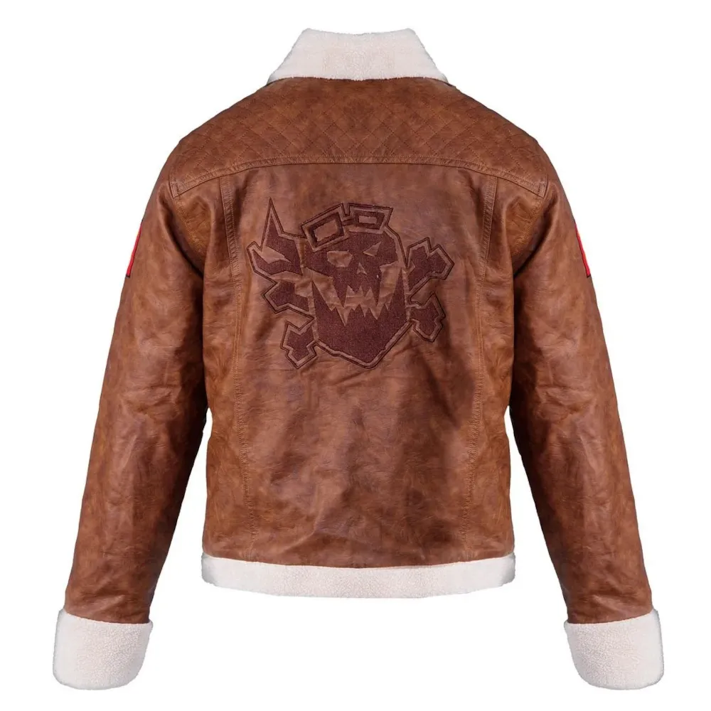 Take to the skies and fly in fashion in our Aviator style Warhammer 40,000 Ork jacket. Decorated with a colourful collection of appliquéd Ork patches and expertly embroidered with the Ork Pilot glyph on the rear. This high-quality jacket is made with premium faux leather outer, quilt-stitched fabric lining, and luxuriously soft faux sheepskin trimmings at the waist, sleeve cuffs, and collar, and equipped with three zip-up pockets for safely storing your essentials.