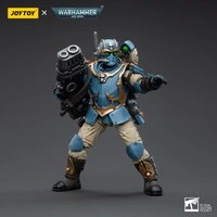 This is a 1/18 scale highly detailed, articulated figure based on Warhammer 40k's Hot-Shot Volley Gunner of the Astra Militarum Tempestus 55th Kappic Eagles. The Volley Gunner figure stands about 4.20 inches tall and comes with several interchangeable parts and accessories, opening the door to a plethora of different and unique display opportunities.