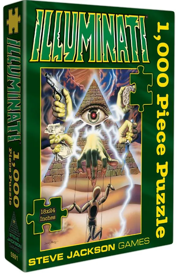 The original 1982 cover for Illuminati has been transformed into a dark, menacing, and totally illuminated 1,000-piece puzzle. The cover art was painted by Dave Martin, who was part of the discussion that inspired the game. The cover shows, in symbolic form, the different ways the Illuminati scheme to take over the world . . . stealth and violence, threats and bribes. The little puppet figure in front became one of the game’s icons, and the Eye in the Pyramid itself became the logo of Steve Jackson Games!